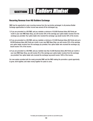 3) If you are promoted to a HGI RMD, and you maintain less than 25,000 Business Value (AV) Points per month in your new RMD Base Shop, you will receive 0% of the earnings your upline leader receives from the exchange you provided. Your upline leader who received the exchange Leg would receive 100% of the income.