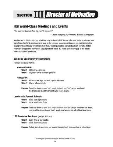 Meetings are a critical component to building a big business in HGI. You can tell a great leader by who and how many follow him/her to great events. As soon as the company announces a big event, you must immediately begin promoting it to your entire team at all of your meetings. Lead by example by always being the first on your team to register for every event. Stay aligned with major HGI events by monitoring up-to-the-minute information at HGICrusade.com.