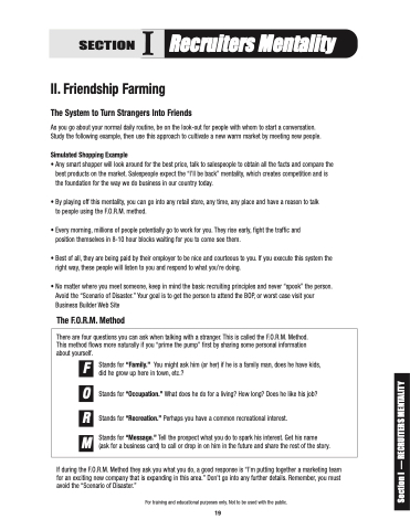 If during the F.O.R.M. Method they ask you what you do, a good response is “I’m putting together a marketing team for an exciting new company that is expanding in this area.” Don’t go into any further details. Remember, you must avoid the “Scenario of Disaster.”