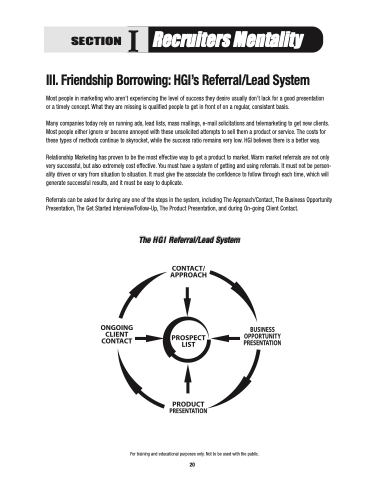 Relationship Marketing has proven to be the most effective way to get a product to market. Warm market referrals are not only very successful, but also extremely cost effective. You must have a system of getting and using referrals. It must not be person- ality driven or vary from situation to situation. It must give the associate the confidence to follow through each time, which will generate successful results, and it must be easy to duplicate.