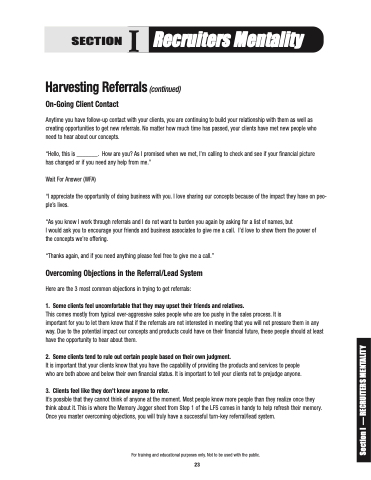 important for you to let them know that if the referrals are not interested in meeting that you will not pressure them in any way. Due to the potential impact our concepts and products could have on their financial future, these people should at least have the opportunity to hear about them.