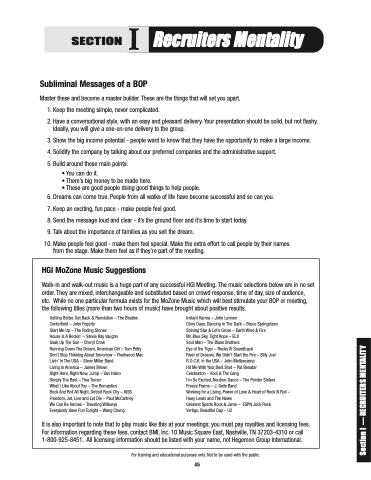 Walk-in and walk-out music is a huge part of any successful HGI Meeting. The music selections below are in no set order. They are mixed, interchangeable and substituted based on crowd response, time of day, size of audience, etc. While no one particular formula exists for the MoZone Music which will best stimulate your BOP or meeting, the following titles (more than two hours of music) have brought about positive results.