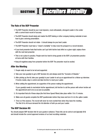 • The BOP Presenter must have a “closer’s mentality” to help move the prospect to a recruit decision.