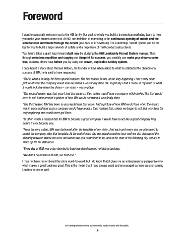 I want to personally welcome you to the HGI family. Our goal is to help you build a tremendous marketing team to help you make your dreams come true. At HGI, our definition of marketing is the continuous opening of outlets and the simultaneous movement through the outlets (see back of LFS Manual). The Leadership Format System will be the key for you to build a large network of outlets and a huge base of multi-product using clients.