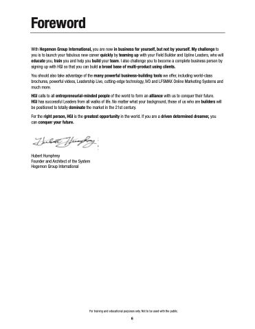 With Hegemon Group International, you are now in business for yourself, but not by yourself. My challenge to you is to launch your fabulous new career quickly by teaming up with your Field Builder and Upline Leaders, who will educate you, train you and help you build your team. I also challenge you to become a complete business person by signing up with HGI so that you can build a broad base of multi-product using clients.