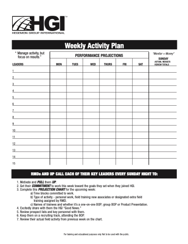 2. Get their COMMITMENT to work this week toward the goals they set when they joined HGI. 3. Complete this PROJECTION CHART for the upcoming week: