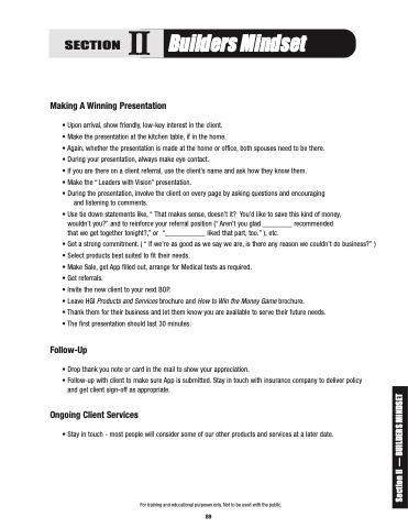 • Use tie down statements like, “ That makes sense, doesn’t it? You’d like to save this kind of money, wouldn’t you?” and to reinforce your referral position (“ Aren’t you glad ________ recommended that we get together tonight?,” or “___________ liked that part, too.” ), etc.
