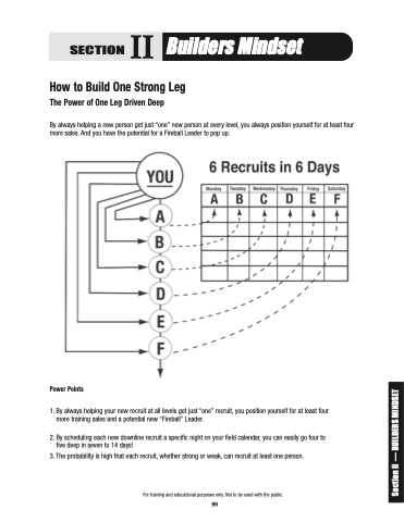 1. By always helping your new recruit at all levels get just “one” recruit, you position yourself for at least four more training sales and a potential new “Fireball” Leader.